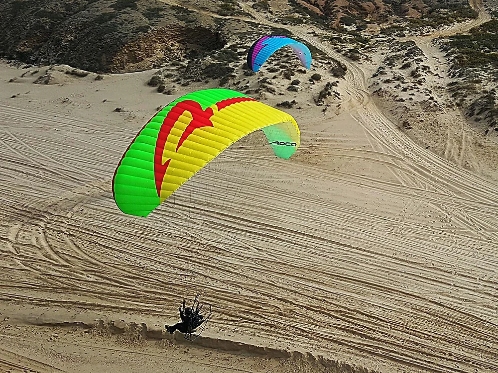 The APCO Thrust remains a prominent fixture in our lineup, renowned for its enduring presence. Designed for both beginner and intermediate pilots, the Thrust is a classic (non-reflex) wing that emphasizes simplicity, safety, and straightforward progression. Its universal appeal has allowed it to withstand the test of time, making it a constant favorite throughout the evolution of paramotor wings.